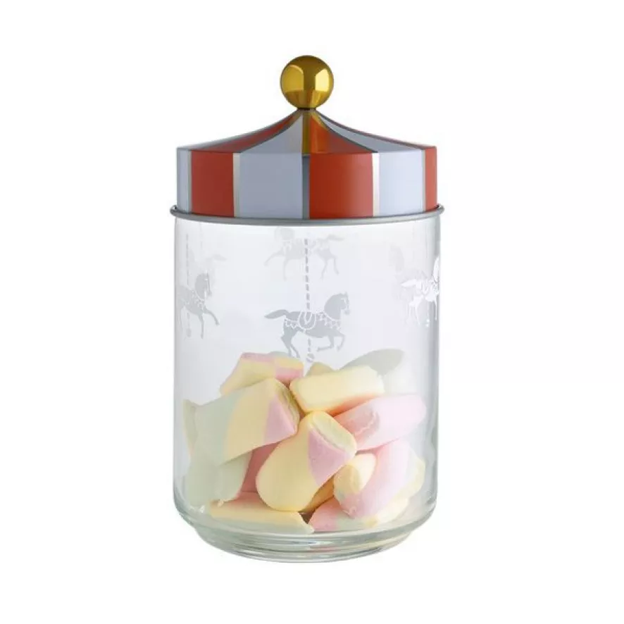 De Circus voorraadpot groot van Alessi maakt onderdeel uit van de Circus serie. De grote voorraadpot heeft een hoogte van 19 centimeter, een diameter van 10,50 centimeter en een inhoud van 100 centiliter. De Circus voorraadpot is gemaakt van gezeefdrukt glas en heeft een deksel van tin met gedrukte decoratie. Je kunt in de Circus voorraadpotten eten opbergen.
