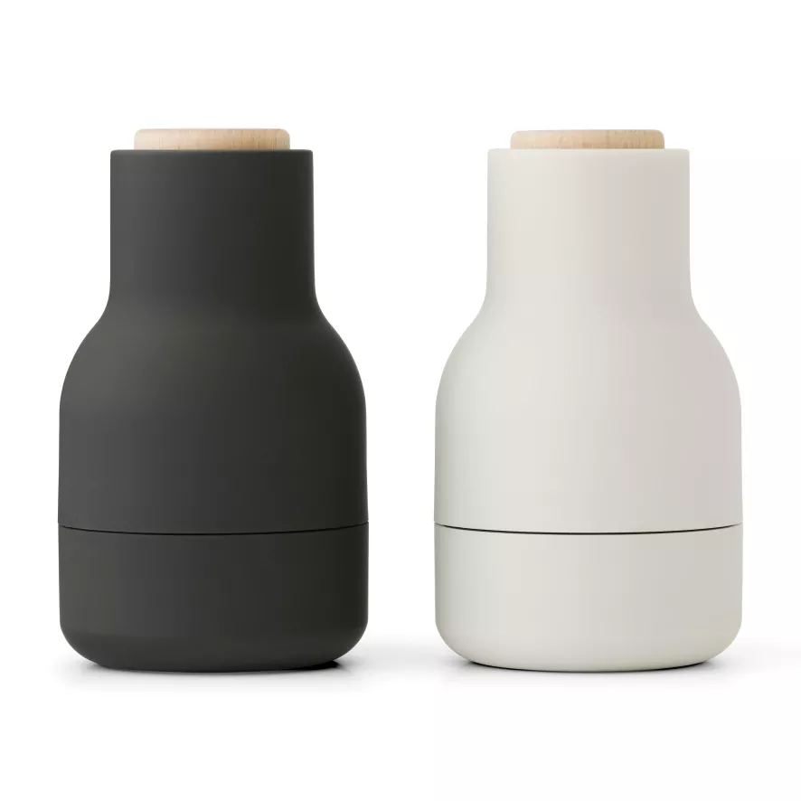 De Audo Copenhagen Bottle Grinder Small peper-en zoutmolen set van 2 is ontworpen door Norm Architects. De Bottle Grinder heeft een diameter van 6,8 centimeter en een hoogte van 11,5 centimeter. De peper-en zoutmolen set is gemaakt van plastic en siliconen en hebben een houten dop van beuken- of walnoothout. De molen is gemaakt van keramiek. De Bottle Grinder small peper-en zoutmolen is alleen geschikt voor peper, zout en andere gedroogde kruiden en is in verschillende kleuren verkrijgbaar. De Bottle Grinders zijn ook in een groter formaat beschikbaar.