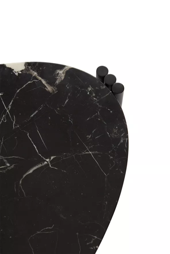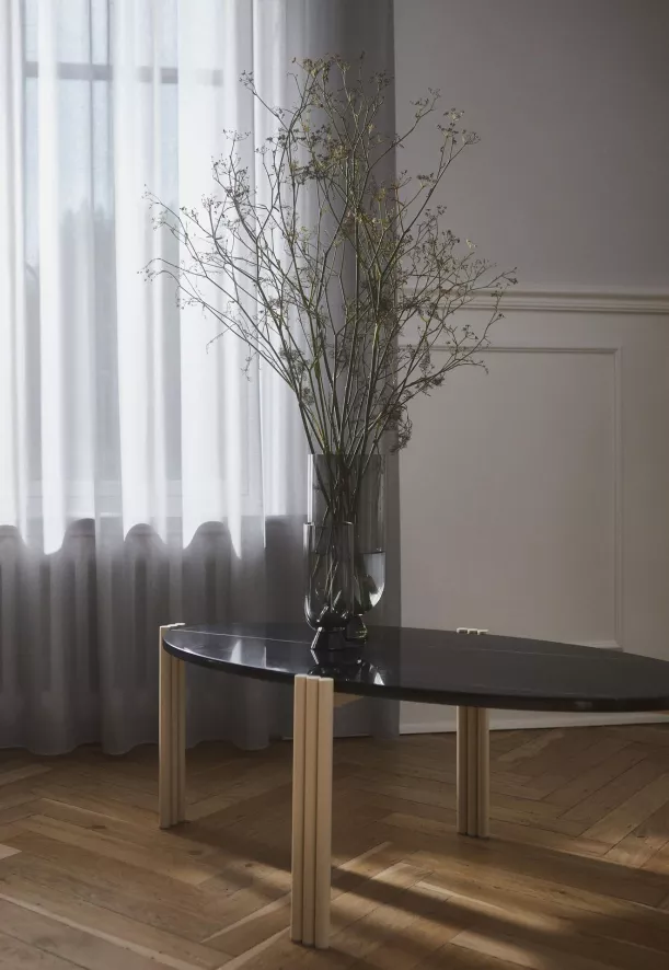 De Tribus ovaal salontafel van AYTM is 92,4 centimeter lang, 47,6 centimeter breed en 35 centimeter hoog. Het tafelblad is ovaal, is gemaakt van marmer of travertin en ligt op stalen poten. De tafel is verkrijgbaar in verschillende uitvoeringen.