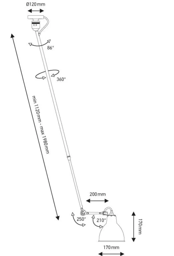 De DCW éditions Lampe Gras N302 L plafondlamp heeft een verstelbare lengte, de lange arm is minimaal 112 centimeter en maximaal 198 centimeter lang. De korte arm is 20 centimeter lang, de kap heeft een diameter van 17 centimeter. De plafondlamp is gemaakt van staal. De armatuur is zwart, de kap is leverbaar in de kleuren zwart, rood, geel, koper of zwart met een koperen binnenkant. Deze plafondlamp heeft een E27-fitting en wordt exclusief lichtbron geleverd.