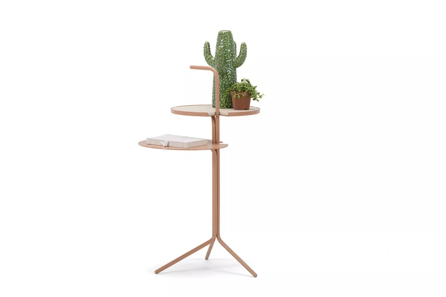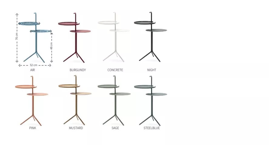 De oo-Two bijzettafel van Design on Stock heeft een frame gemaakt van gestanst staal. Het staal heeft een gekleurde poedercoating. Voor deze coating kun je kiezen uit de kleuren Air, Burgundy, Concrete, Night, Pink, Mustard, Sage en Steel Blue. De tafel heeft een hoogte van 76 centimeter en een breedte van 52 centimeter. Beide tafelbladen hebben een diameter van 33 centimeter en het onderste tafelblad vind je op de hoogte van 48 centimeter. Het bovenste tafelblad heeft een toplaag van houten essenfineer in een donkere finish.