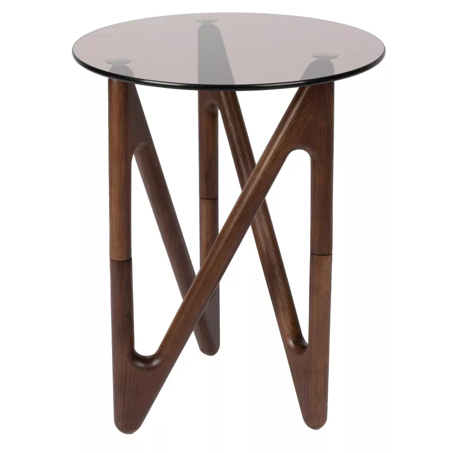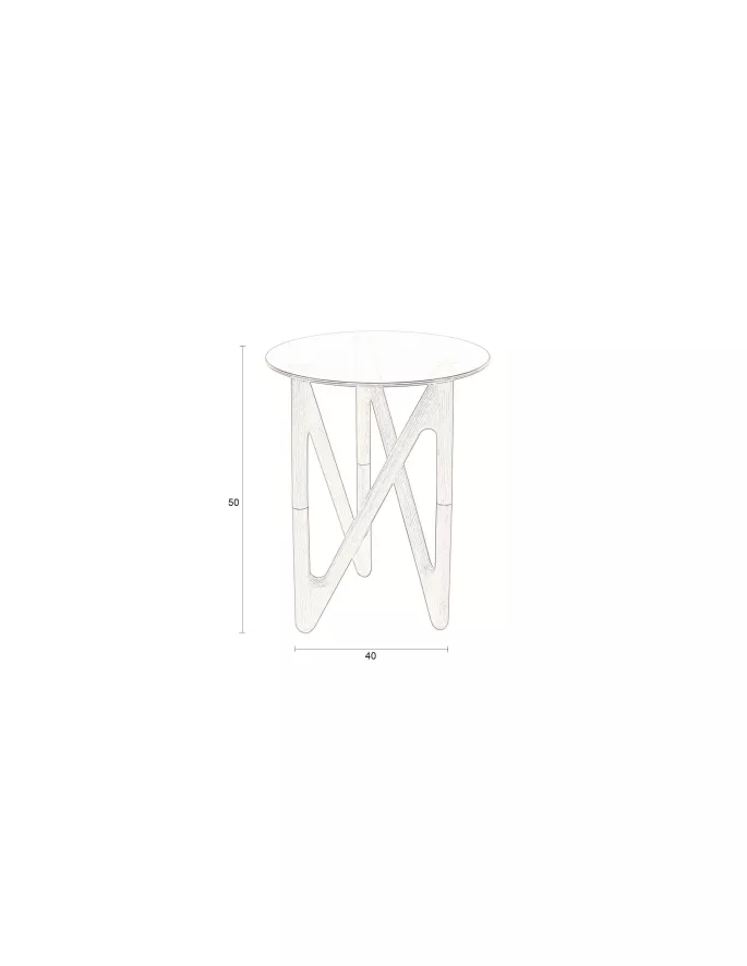 De Naia bijzettafel van Dutchbone heeft een diameter van 40 centimeter en een hoogte van 50 centimeter. Het tafelblad heeft een dikte van 0,8 centimeter en de tafelpoten hebben een breedte van 3 centimeter. Het tafeltje is gemaakt van massief eikenhout en het tafelblad is gemaakt van donker gekleurd glas.