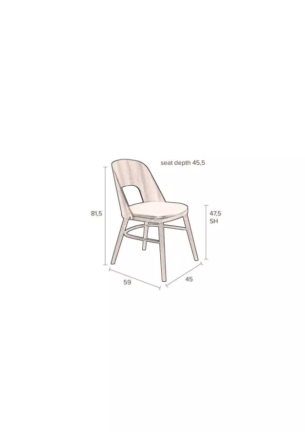 De Talika Stoel van Dutchbone is 45 centimeter breed, 59 centimeter diep en 81,5 centimeter hoog. De zithoogte is 47,5 centimeter en de zitdiepte is 47,5 centimeter. De stoel is gemaakt van 55% PVC en 45% polyester en heeft een frame van multiplex met walnootfineer. De stoel heeft stevige rubberhouten poten en een maximaal draaggewicht van 100 kilogram.