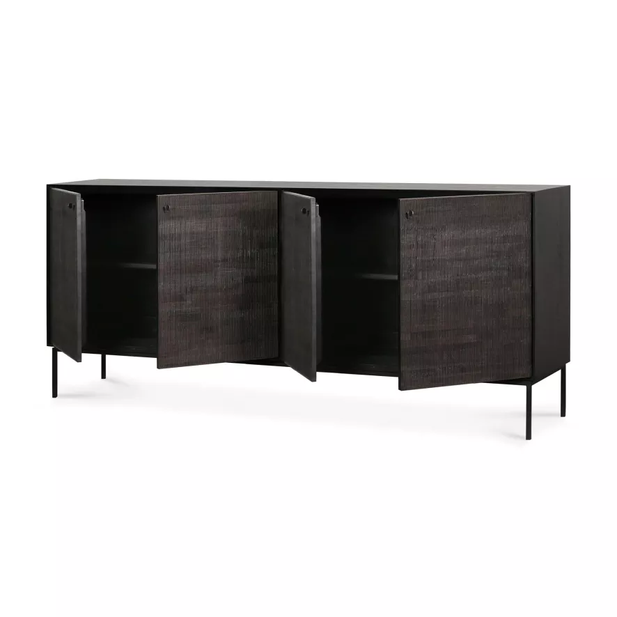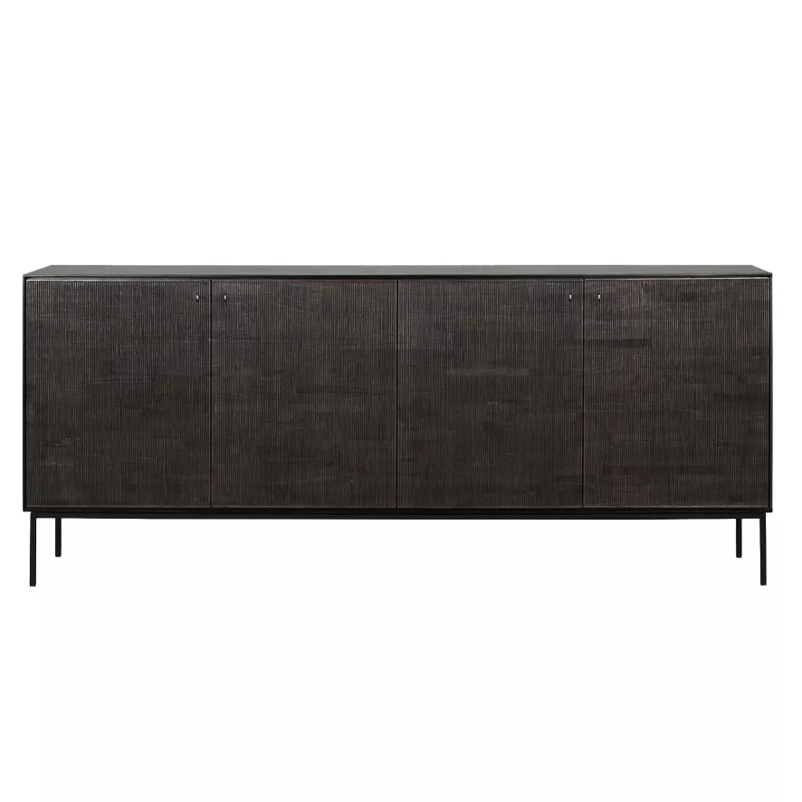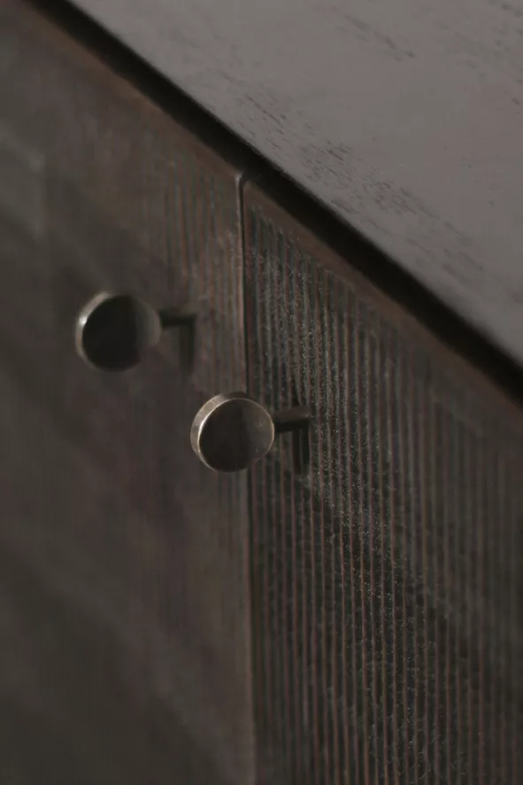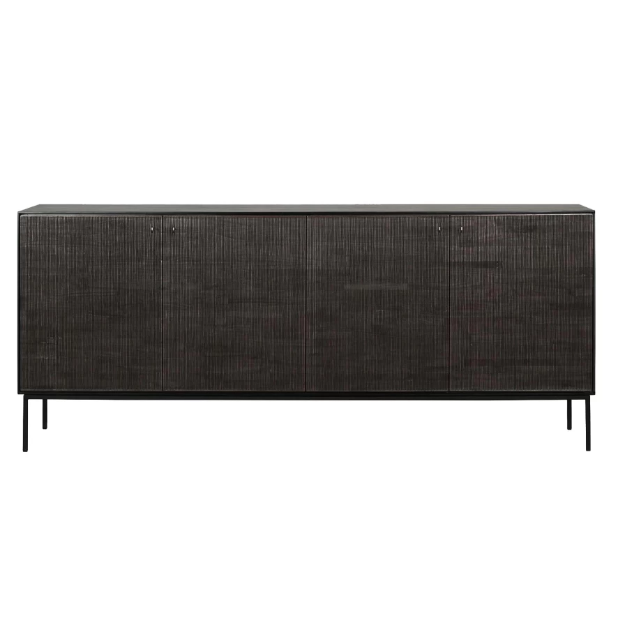 Het Grooves dressoir 202×45 van Ethnicraft heeft een breedte van 202 centimeter, een diepte van 45 centimeter en een hoogte van 87 centimeter. Dit dressoir heeft een metalen onderstel dat met een mat, zwarte poedercoat afgewerkt is. De kast zelf is gemaakt van 100% teakhout. De kast is voorzien van drie deuren die met behulp van een push-to-open-systeem geopend en gesloten kunnen worden. Dit dressoir heeft een gewicht van 65,3 kilogram en een maximum draaggewicht van 160 kilogram. Het Grooves dressoir 202×45 van Ethnicraft komt uit de Grooves collectie en is in verschillende uitvoeringen verkrijgbaar.