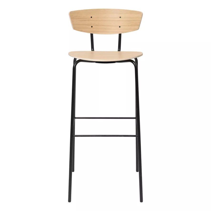 De Herman barkruk hoog van Ferm Living is 96 centimeter hoog, 40,5 centimeter breed en 43 centimeter diep. De zithoogte is 76 centimeter. Het zitvlak en de rugleuning zijn gemaakt van geverfd eikenfineerhout. De poten zijn gemaakt van gecoat metaal. Maak de Herman schoon met een vochtige doek.