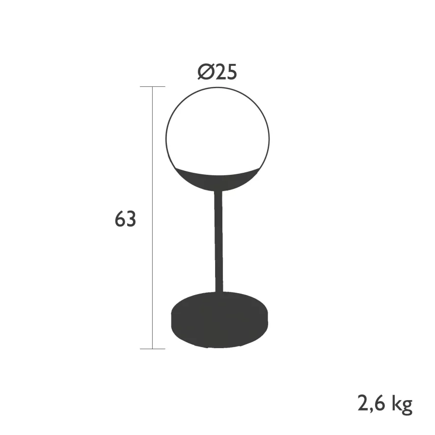 De Fermob MOOON! Tafellamp H63 LED heeft een diameter van 25 centimeter en is 63 centimeter hoog. De tafellamp is geschikt voor zowel binnen als buiten. De lamp heeft een batterijduur van 7-13 uur en heeft een lichtopbrengst van 500 lumen. De MOOON! tafellamp is gemakkelijk te gebruiken via Bluetooth en compatibel met de Fermob smartphone applicatie. Laadstation wordt meegeleverd. De Fermob MOOON! Tafellamp H63 LED is ontworpen door Tristan Lohner en is verkrijgbaar in verschillende kleuren. De tafellamp is ook verkrijgbaar met een hoogte van 40 centimeter en 134 centimeter.