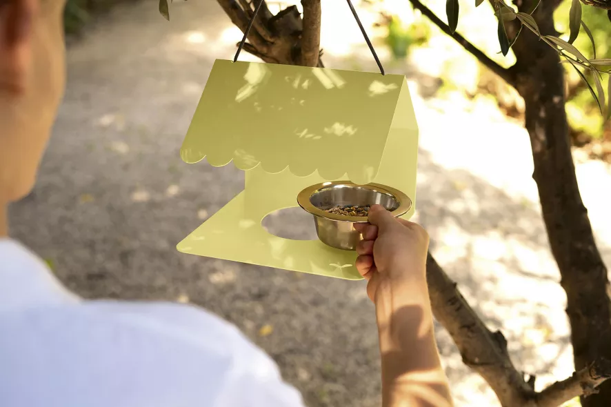 Het Picoti vogelvoerhuisje van Fermob is ontworpen door Catherine Sofia. Het huisje is 20 centimeter breed, 18 centimeter diep, 16,5 centimeter hoog en weegt 0,8 kilogram. Het vogelhuis heeft een stalen frame, een uitneembare roestvrijstalen kom en een 100% polyester buitenkoord. Het voederhuisje is voorzien van een dubbelbevestigingssysteem: een ophangkoord of schroeven (niet meegeleverd). Het Picoti vogelvoederhuisje is verkrijgbaar in verschillende kleuren.