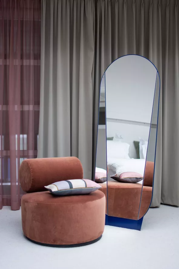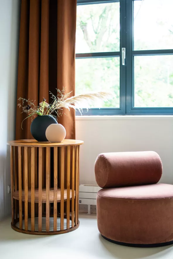 De Sinclair fauteuil van Fést Amsterdam heeft een diameter van 74 centimeter en een totale hoogte van 71 centimeter. De zithoogte van deze fauteuil is 40 centimeter en de zitdiepte is 42 centimeter. De fauteuil heeft een onderstel van MDF en fineer en een basis van beukenhout. De Sinclair fauteuil is opgevuld met foam dat bekleed is met één van de Fést stoffen of een Kvadrat stof. De Sinclair fauteuil van Fést Amsterdam is verkrijgbaar in drie kleuren.