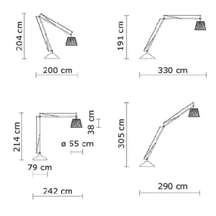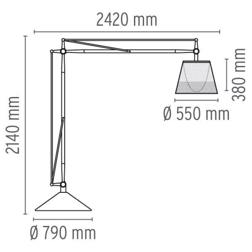 De Superarchimoon Outdoor vloerlamp van Flos is een flinke jongen. De hoogte is verstelbaar van 191 centimeter tot 305 centimeter. De breedte is verstelbaar van 200 centimeter tot 330 centimeter. De voet heeft een diameter van 79 centimeter. De kap heeft een diameter van 55 centimeter en een hoogte van 38 centimeter. Het snoer heeft een lengte van 10 meter.