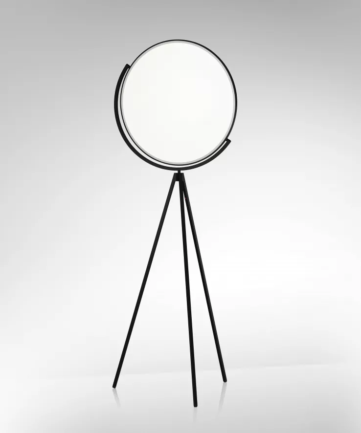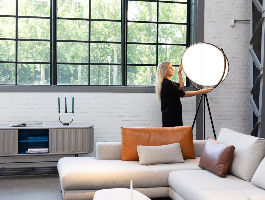 De Superloon vloerlamp van Flos heeft een hoogte van 197,2 centimeter, een breedte van 72,3 centimeter en het draaibare, ronde lichtgevende onderdeel van de lamp heeft een diameter van 75,4 centimeter. Je kunt voor de Superloon lamp kiezen uit de kleuren zwart, wit en chroom. De lamp heeft een ‘Dim-to-warm’ functie; als de intensiteit van het licht afneemt gaat de kleur van koud blauw naar een warmer spectrum. De Soft Touch dimmer zit in de tripod voor een optimale interactie met de lamp.