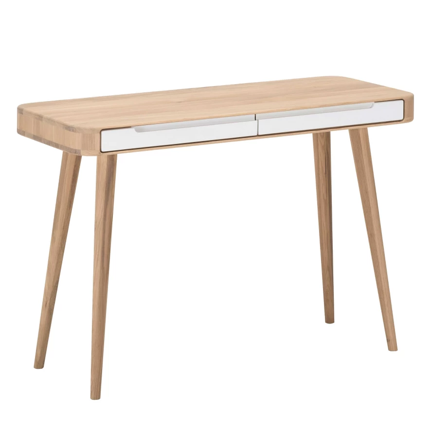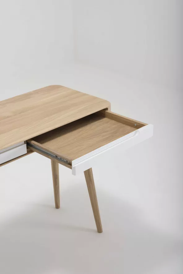 De Ena kleed tafel van Gazzda heeft een lengte van 110 centimeter, een breedte van 42 centimeter en een hoogte van 75 centimeter. Het gewicht van de tafel is 75 centimeter. De tafel is handgemaakt van massief, wild eikenhout. Hierdoor is iedere tafel verschillend en dus uniek. De tafel heeft twee lades met een wit MDF oppervlak. Beide lades zijn voorzien van een soft-close systeem, zodat ze geleidelijk en geruisloos sluiten. De binnenkant van de lades is ongeveer 3 centimeter hoog.