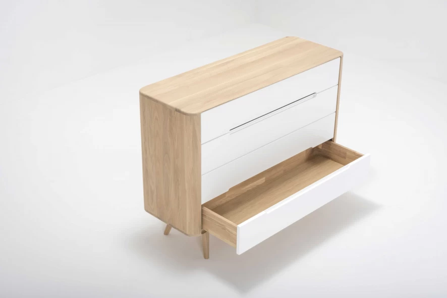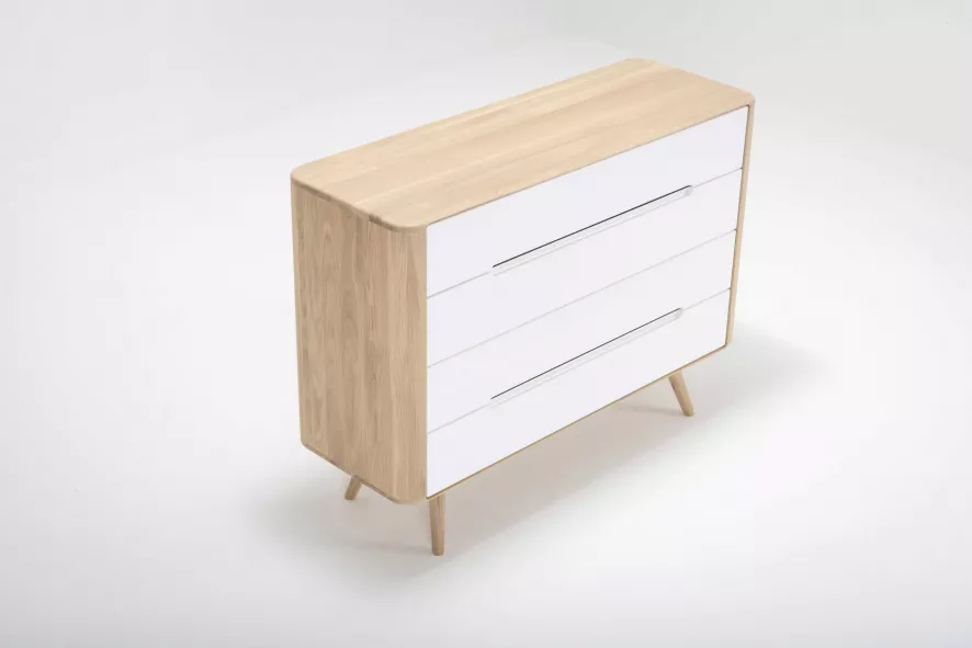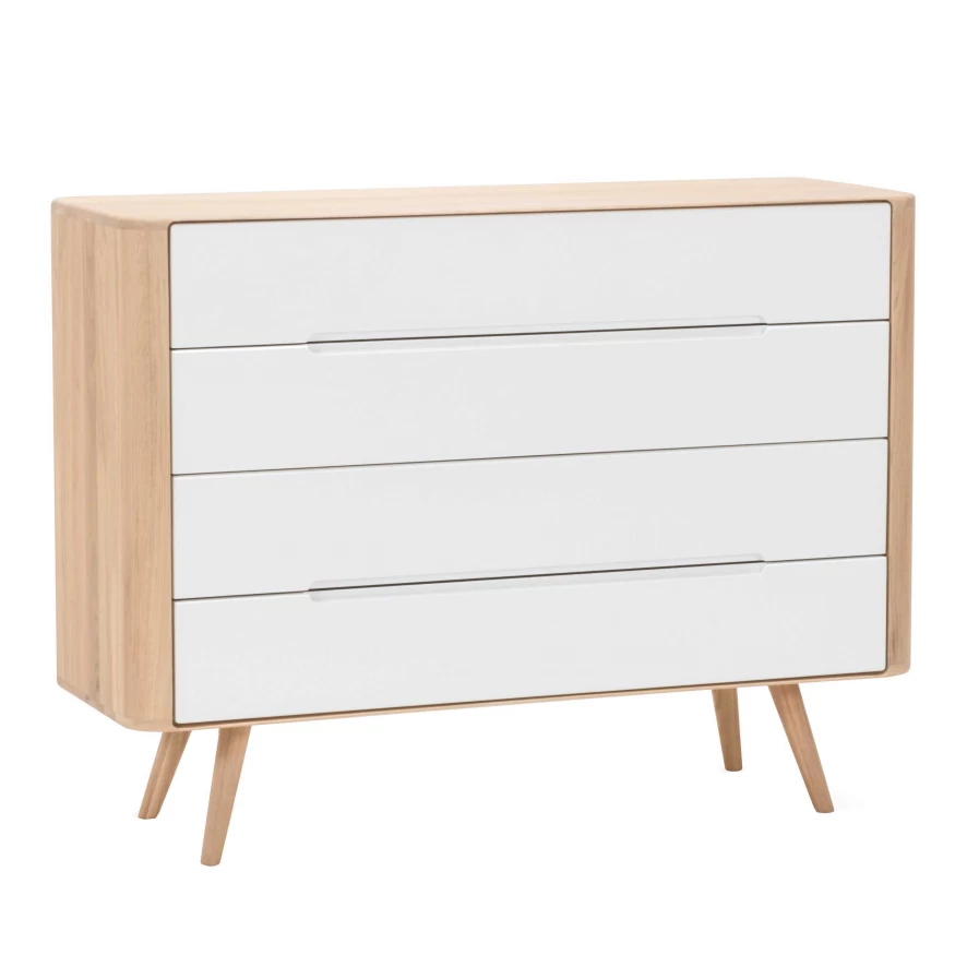 De Ena ladekast twee van Gazzda heeft een breedte van 120 centimeter, een hoogte van 90 centimeter en een diepte van 42 centimeter. De kast heeft een gewicht van 64 kilogram. De kast is handgemaakt van massief (wild) eikenhout. Hierdoor is iedere kast uniek. De kast is voorzien van 4 witte lades, met een wit MDF oppervlak. De lades zijn voorzien van een soft-close systeem, zodat ze geleidelijk en geruisloos sluiten. De kast wordt gemonteerd geleverd. Alleen de pootjes moeten er nog onder gezet worden.