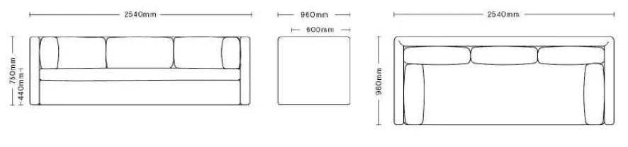 De Hackney Sofa bank van Hay heeft een breedte van 254 centimeter, een diepte van 96 centimeter en hoogte van 75 centimeter. De zithoogte is 39 centimeter. De bank heeft een houten frame met een zitting van polyurethaanschuim. Deze bank is leverbaar in allerlei verschillende kleurstoffen. In dezelfde serie is er ook een tweezitsbank en een fauteuil.