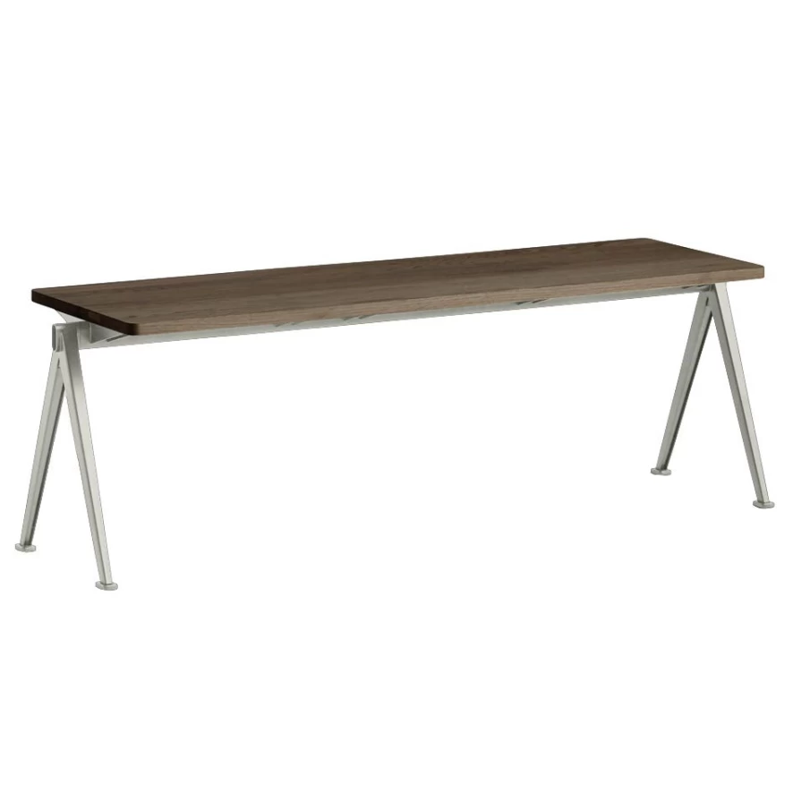 De zitting van de Pyramid 11 eetbank 140×40 van HAY is gemaakt van massief eiken en heeft een dikte van 2,1 centimeter. Het frame is van plaatstaal met een poedercoat. Er zijn meerdere uitvoeringen mogelijk: de zitting kan met een transparante of een matte lak óf in een geoliede variant van gerookt eiken geleverd worden. Het frame is verkrijgbaar met een beige of een zwarte poedercoat. Deze bank heeft een breedte van 140 centimeter, een diepte van 40 centimeter en een hoogte van 46 centimeter.