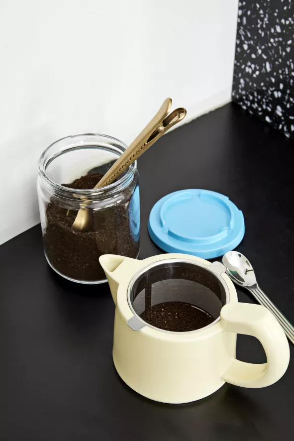 De Coffee koffiepot small van Hay is 19,5 centimeter breed, 11,5 centimeter diep en 11 centimeter hoog. De koffiepot heeft een inhoud van 0,45 liter. Hij is gemaakt van porselein. Het filter is gemaakt van roestvrij staal. De deksel is gemaakt van plastic. De pot is lichtgeel en de deksel heeft een blauwe rand. De rest van de deksel is bruin.