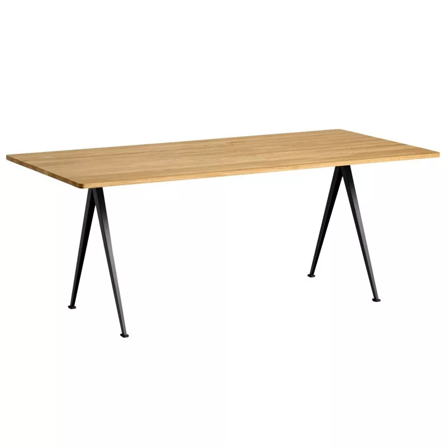 Het tafelblad van de Pyramid 02 tafel 190×85 van HAY is gemaakt van massief eiken en heeft een dikte van 2,1 centimeter. Het frame is van plaatstaal met een poedercoat. Er zijn meerdere uitvoeringen mogelijk: het tafelblad kan met een transparante of een matte lak óf in een geoliede variant van gerookt eiken geleverd worden. Het frame is verkrijgbaar met een beige of een zwarte poedercoat. Deze tafel heeft een breedte van 190 centimeter, een diepte van 85 centimeter en een hoogte van 74 centimeter.