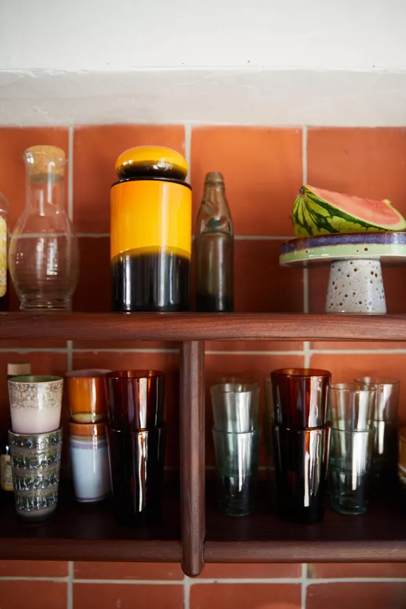 De 70’s Ceramic voorraadpot van HKliving is gemaakt van keramiek en bevat een siliconen ring voor een veilige afsluiting. De voorraadpot heeft een diameter van 11 centimeter en een hoogte van 22,5 centimeter. De inhoud van de voorraadpot is 1000 ml. De 70’s Ceramic voorraadpot weegt 1120 gram. De potten zijn vaatwasser- en voedselbestendig, maar niet geschikt voor de magnetron.