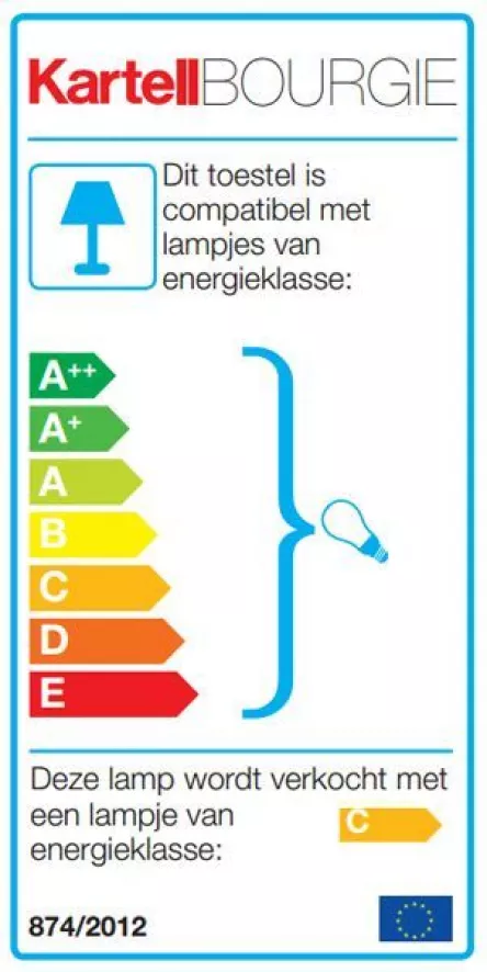 De Bourgie tafellamp van Kartell is gemaakt van polycarbonaat (kunststof). De lamp heeft een diameter van 37 centimeter, en een verstelbare hoogte die kan variëren van 68 tot 78 centimeter. Deze lamp heeft 3 E14 fittingen (max 28 watt). De lichtbronnen worden meegeleverd. Het licht is dimbaar dankzij de ingebouwde dimmer. De Bourgie tafellamp is verkrijgbaar in verschillende kleuren.