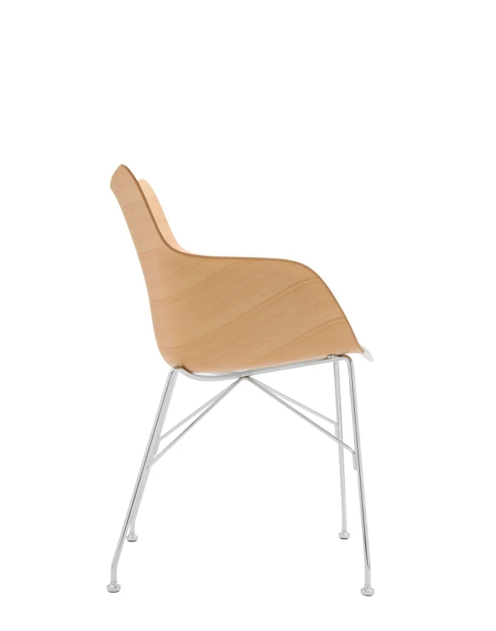 De Q/Wood stoel met armleuning eiken fineer van Kartell is 55 centimeter breed, 57 centimeter diep en 83 centimeter hoog. De stoel heeft een zithoogte van 45 centimeter en een armleuninghoogte van 66 centimeter. De zitting is gemaakt van eikenfineer en de stoelpoten zijn van staal. De stoel is voor binnen gebruik en is verkrijgbaar in meerdere kleuren.