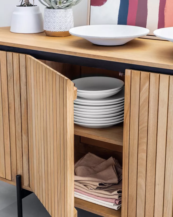Het Licia dressoir 170×80 van Kave Home heeft een breedte van 170 centimeter, een diepte van 49,5 centimeter en een hoogte van 80 centimeter. Dit dressoir is met de hand gemaakt van massief en duurzaam gekapt mangohout en acaciahout. Het frame en onderstel van dit dressoir zijn gemaakt van ijzer dat met een matte poedercoat is afgewerkt. De poten van het dressoir zijn voorzien van vilten vloerbeschermers. Het dressoir is voorzien van vier deuren waarachter acht opbergvakken schuilgaan. Iedere plank heeft een maximum draaggewicht van 5 kilogram. Dit dressoir heeft een gewicht van 65 kilogram en een maximum draaggewicht van 50 kilogram. Het Licia dressoir 170×80 van Kave Home komt uit de Licia collectie en is in verschillende uitvoeringen verkrijgbaar.