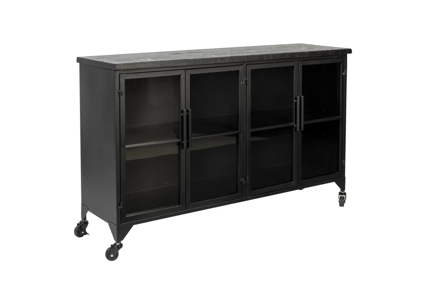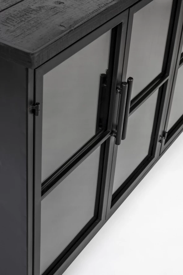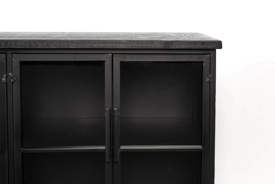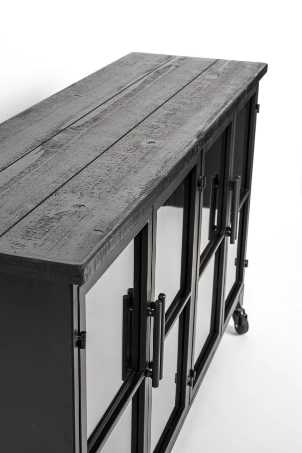 Het Six dressoir van Livingstone Design heeft een breedte van 120 centimeter, een diepte van 35 centimeter en een hoogte van 75 centimeter. Het dressoir is gemaakt van massief MDF-hout en dennenfineer dat met een zwarte lak is afgewerkt. De vastgezette plank is gemaakt van massief MDF-hout en gaat schuil achter vier deurtjes met zwart, gepoedercoate, ijzeren handvaten en gehard glas. Het dressoir is voorzien van vier zwenkwieltjes waarvan er twee vergrendeld kunnen worden. Het dressoir heeft een gewicht van 26 kilogram en heeft een maximum draaggewicht van 25 kilogram. Het Six dressoir van Livingstone Design is ook als vitrine verkrijgbaar.