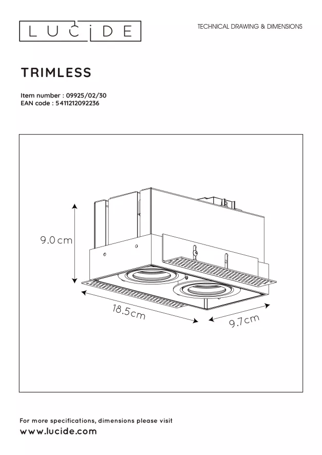De Lucide Trimless inbouwspot medium heeft een breedte van 18,5 centimeter, een diepte van 15,7 centimeter en een hoogte van 9 centimeter. De inbouwdiepte van deze spot is daarmee ook 9 centimeter. Deze inbouwspot is gemaakt van hoogwaardig aluminium en is afgewerkt met een poedercoat. De benodigde lichtbronnen voor deze inbouwspot worden niet meegeleverd. Voor deze inbouwspot heb je twee lichtbronnen met een GU10 fitting van maximaal 50 Watt nodig. De lichtbronnen zijn draaibaar, kantelbaar en gemakkelijk aan te sluiten op een dimmer. De inbouwspot heeft een IP-waarde van 20 en mag hierdoor alleen binnenshuis gebruikt worden. De Trimless inbouwspot medium van Lucide heeft een gewicht van 0,92 kilogram en is in verschillende uitvoeringen verkrijgbaar.