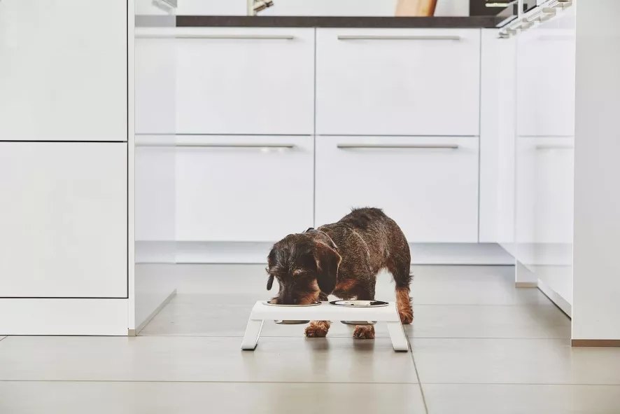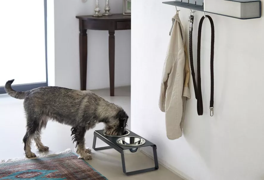 De Desco hondenvoerbak medium is 58 centimeter lang, 26 centimeter breed en 17 centimeter hoog. Door siliconen aan de onderkant verschuift de bak niet maar blijft hij altijd op zijn plek. Het frame van het ontwerp is verkrijgbaar in twee verschillende materialen: multiplex of aluminium. Het aluminium is gepoedercoat in verschillende kleuren. Bij de multiplex versie heb je keuze uit walnoot of essenhout, in verschillende coatings. De bakken zijn van roestvrijstaal en hebben ieder een inhoud van 1,3 liter en een diameter van 17 centimeter en kunnen gewoon in de vaatwasser. De Desco hondenvoerbak medium heeft een German Design Award 2019 gewonnen en is ontworpen door Mathias De Ferm.