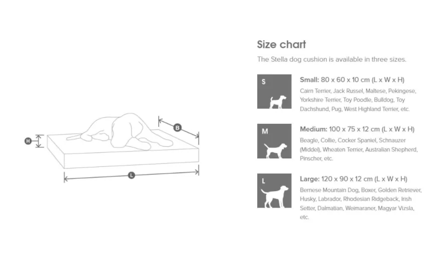 Het MiaCara Stella hondenkussen large is 120 centimeter lang, 90 centimeter breed en 12 centimeter hoog. Dat maakt het hondenkussen geschikt voor grote honden zoals een Berner Sennenhond, Boxer of een Golden Retriever. Het kussen is 60% gemaakt van katoen en 40% van polyester. De vulling van het kussen is 100% gemaakt van polyurethaanschuim. Dat betekent dat het hondenkussen stabiel, duurzaam, hypoallergeen en permanent elastisch is. Het kussen kan worden gewassen tot 60ºC. Er wordt echter aangeraden om géén gebruik te maken van gechloreerde en chemisch agressieve wasproducten. Het MiaCara Stella hondenkussen is verkrijgbaar in verschillende kleuren en formaten.