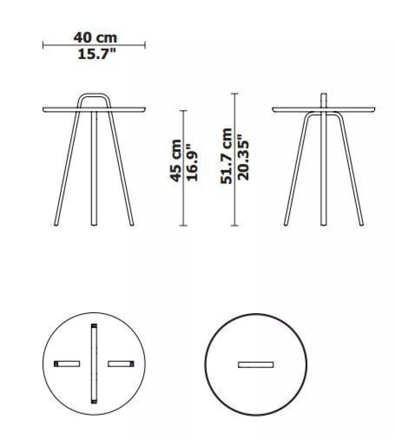 De Montis Tor bijzettafel is exclusief handvat 45 centimeter hoog, inclusief handvat is dit 52 centimeter. Het tafelblad heeft een diameter van 40 cm en is 4 mm dik. De poten en het handvat van de lichte tafel zijn slechts 20 mm breed en 12 mm dik. De tafel is gemaakt van aluminium en verkrijgbaar in verschillende kleuren. Aan de onderkant van de poten zitten kunststof dopjes, de Montis Tor bijzettafel kan je dus overal veilig neerzetten.