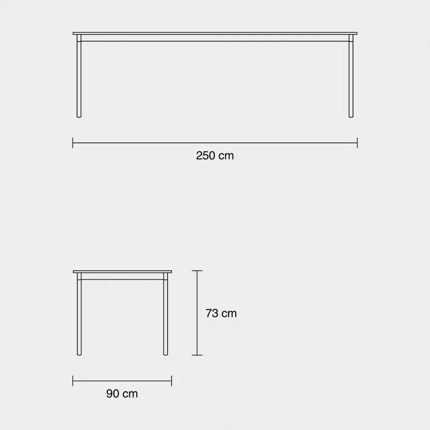 De Muuto Base tafel 250×90 is 250 centimeter lang, 90 centimeter breed en 73 centimeter hoog. De basis van de tafel bestaat uit geverfd aluminium, het tafelblad is gemaakt van laminaat of linoleum (in de kleur zwart). Je kunt kiezen voor een rand van de kunststof ABS of van multiplex. De tafel is verkrijgbaar in verschillende kleuren. De afmetingen van de tafel zijn ideaal om plaats te bieden aan acht personen.