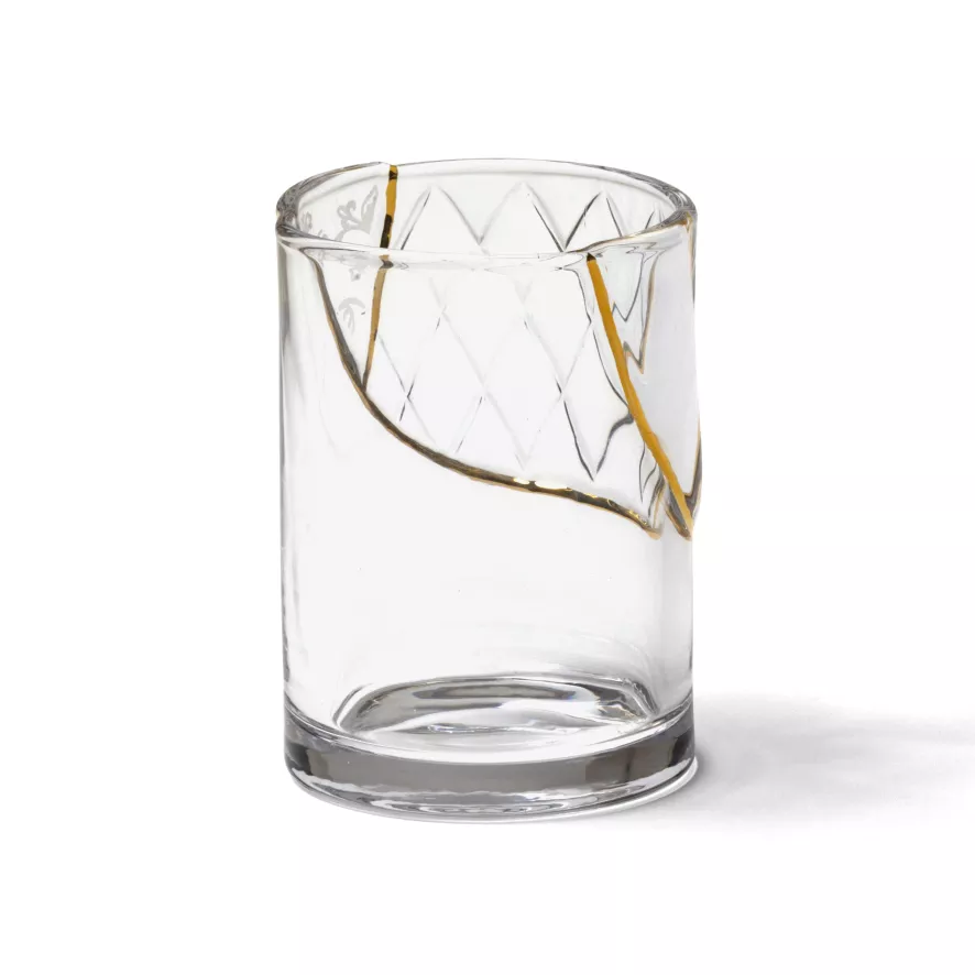 Het glas heeft een diameter van 8.5 centimeter en is 9.5 centimeter hoog. Het gebruikte goud om de verschillende stukken glas aan elkaar te bevestigen bestaat uit een mix van verschillende materialen, waaronder kleine deeltjes 24-karaats goud. Het glas is er in drie verschillende varianten en in de Kintsugi serie zitten naast glazen ook vazen, borden, placemats en andere producten.