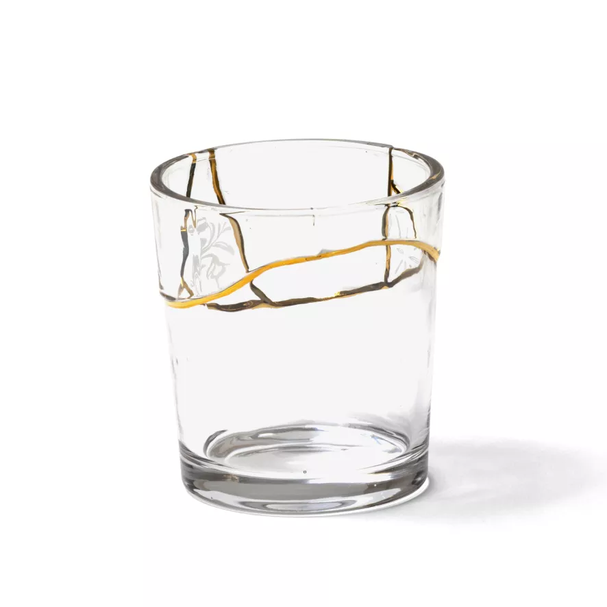 Het glas heeft een diameter van 8.5 centimeter en is 9.5 centimeter hoog. Het gebruikte goud om de verschillende stukken glas aan elkaar te bevestigen bestaat uit een mix van verschillende materialen, waaronder kleine deeltjes 24-karaats goud. Het glas is er in drie verschillende varianten en in de Kintsugi serie zitten naast glazen ook vazen, borden, placemats en andere producten.