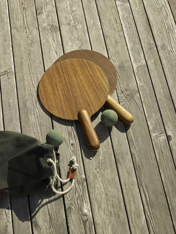 Dit spel is een set van twee teakhouten rackets, twee rubberen balletjes en een canvas hoes. De balletjes hebben een diameter van 5,5 centimeter. De rackets zijn 24 centimeter breed, 2,5 centimeter diep en 36 centimeter lang. Er zijn ook nog drie extra ballen los bij te bestellen. Kijk daarvoor bij de bijpassende producten op deze pagina.