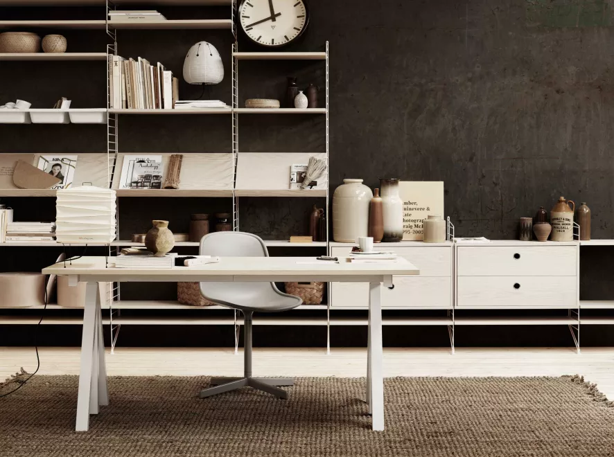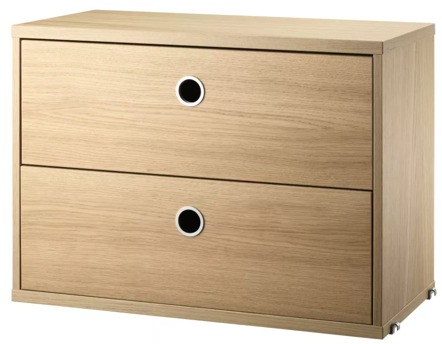 Dit is de Kast met twee lades 58x30x42 cm van String. De kast heeft een breedte van 58centimeter en een diepte van 30 centimeter. De kast is leverbaar in verschillende varianten.