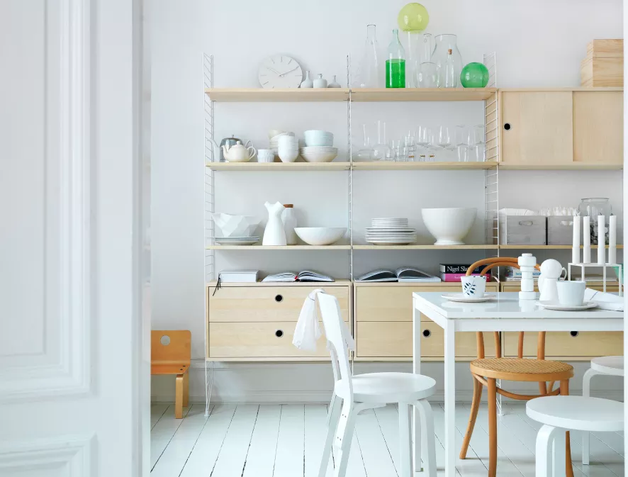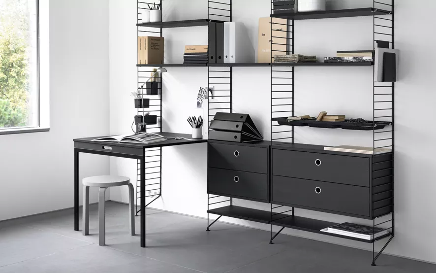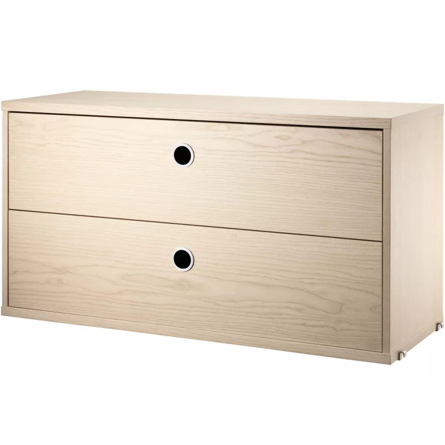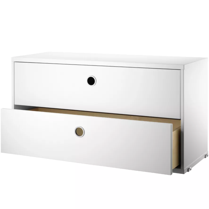 Dit is de Kast met twee lades 78x30x42 cm van String. De kast heeft een breedte van 78 centimeter en een diepte van 30 centimeter. De kast is leverbaar in zes varianten: wit MDF, grijs MDF, zwart MDF, berken, walnoot en eikenhout.