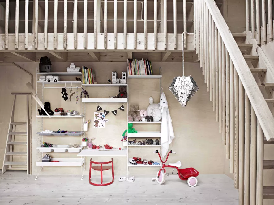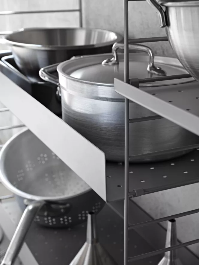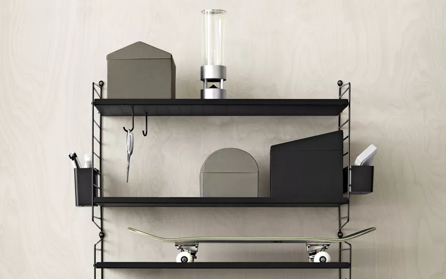 Metal shelf low edge 78×30 1-pack van String wordt gemaakt van gelakt metaal en is verkrijgbaar in drie kleuren: wit, grijs of zwart. De plank heeft een breedte van 78 centimeter, een diepte van 30 centimeter en een hoogte van 2 centimeter.