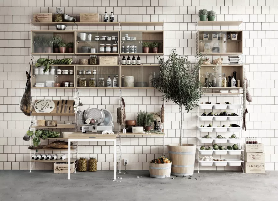 Dit is de Vitrinekast 78x30x42 cm van String. De kast heeft een breedte van 78 centimeter en een diepte van 30 centimeter. De kast is leverbaar in zes varianten: wit MDF, grijs MDF, zwart MDF, berken, walnoot en eikenhout.