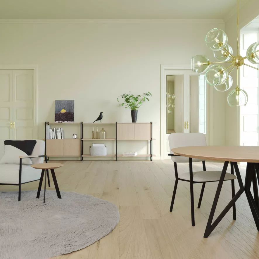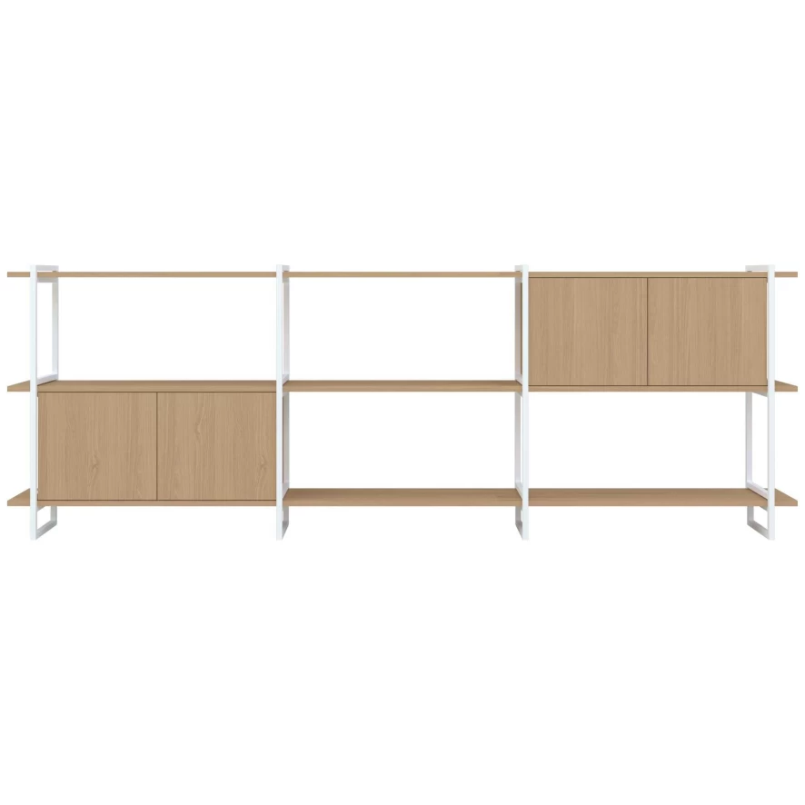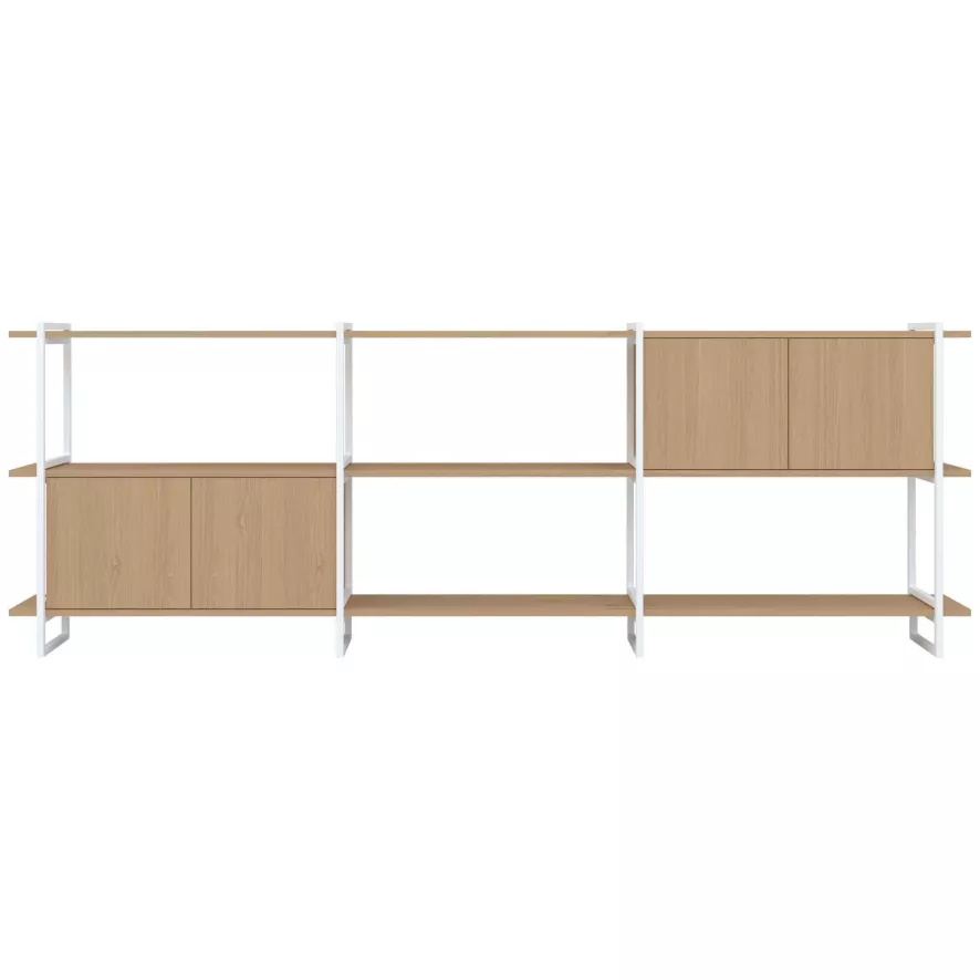 De Modular Cabinet MC-3L stellingkast 290x101van Studio HENK heeft een lengte van 290 centimeter, een diepte van 34,5 centimeter en een hoogte van 101 centimeter. De modulaire stellingkast heeft een frame van staal en heeft eikenhouten planken. Voor het eikenhout kan je kiezen uit een variant die behandeld is met hardwax naturel of een die behandeld is met een twee-componenten lak. De Modular Cabinet stellingkast is ook in andere afmetingen verkrijgbaar, onderling kan je de verschillende kasten goed combineren.