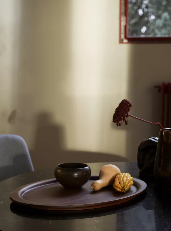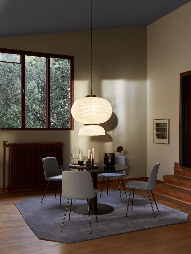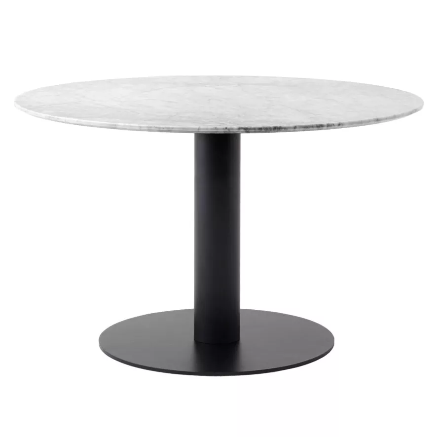 De In Between SK19 tafel 120 van &Tradition heeft een diameter van 120 centimeter en een hoogte van 73 centimeter. De tafel heeft een onderstel van staal dat met een poedercoat is afgewerkt. Het onderstel is verkrijgbaar in een mat zwarte variant of in een bronskleurige variant en is standaard voorzien van vilten vloerbeschermers. Het tafelblad is verkrijgbaar in zwart Nero Marquina marmer of in wit Bianco Carrara marmer.