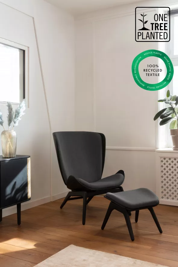 De The Reader fauteuil zwart eiken van Umage is 105 centimeter hoog, 78 centimeter breed en 91 centimeter diep. De zithoogte van de stoel is 43 centimeter. De bekleding van de stoel is gemaakt van polyester. Je kan kiezen uit vijf verschillende kleuren bekleding. Het onderstel van de fauteuil is gemaakt van solide eiken, gelakt met fineerlak. Er zijn ook The Reader fauteuils beschikbaar met onderstellen van ander materiaal. Umage plant voor ieder verkocht houten meubelstuk een boom.