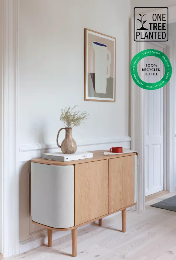 Dit is het Treasures dressoir 2 eiken van Umage. Dit dressoir is gemaakt van massief eikenhout, spaanplaat en staal. Het dressoir is 75 centimeter hoog, 109 centimeter lang en 43 centimeter diep. Het Treasures dressoir is er met verschillende zijkanten en er is ook een variant met donker eikenhout beschikbaar of met drie deurtjes in plaats van twee. Umage plant voor ieder verkocht houten meubelstuk een boom.