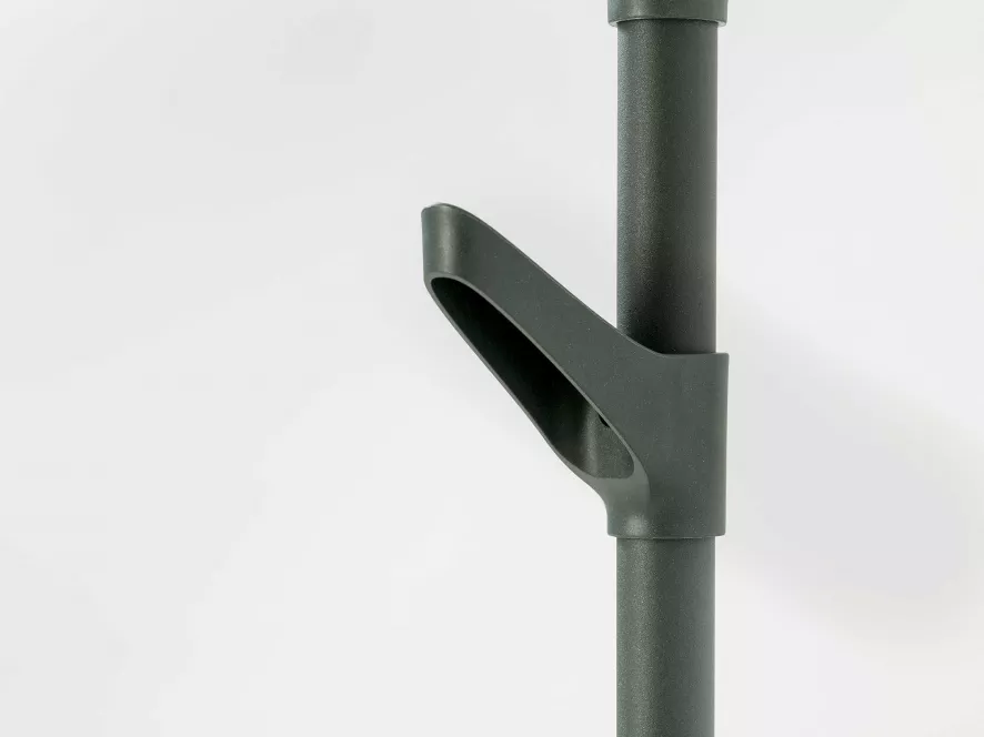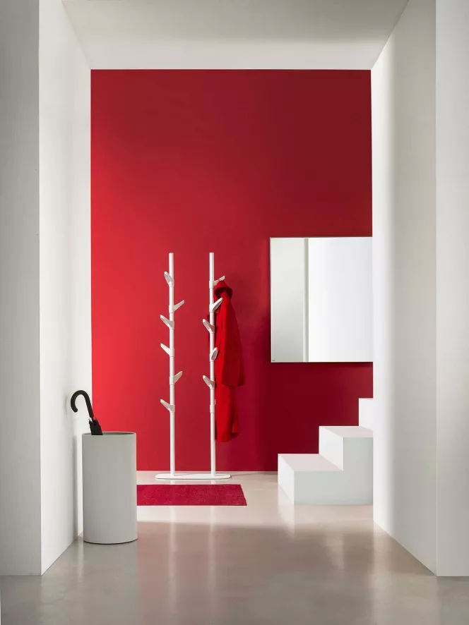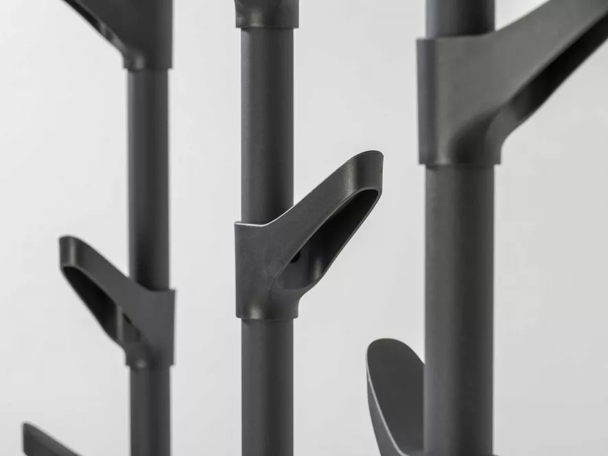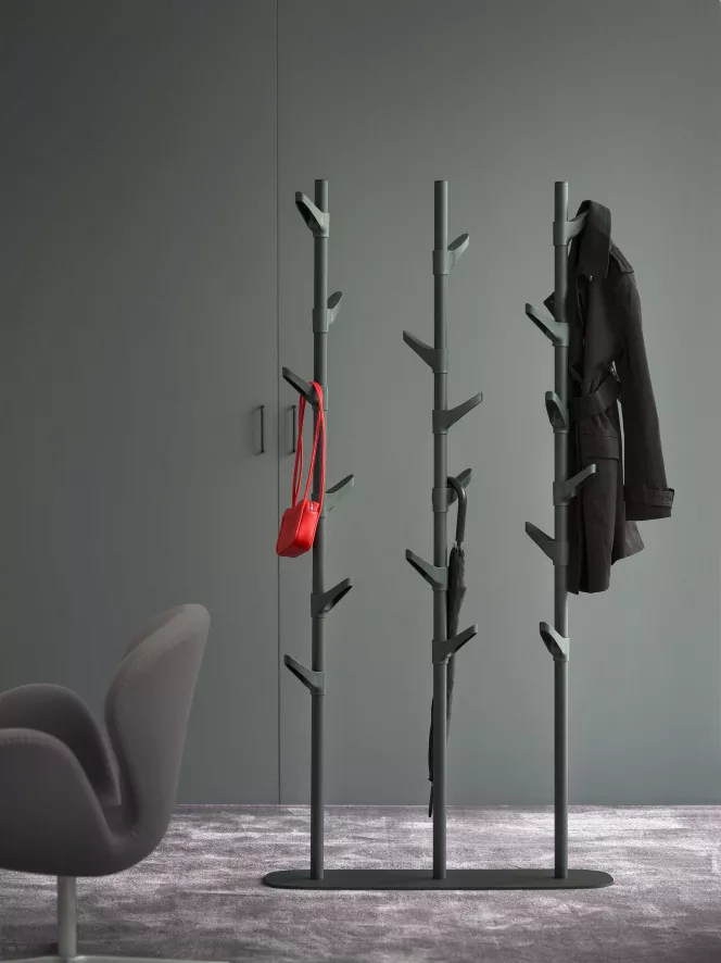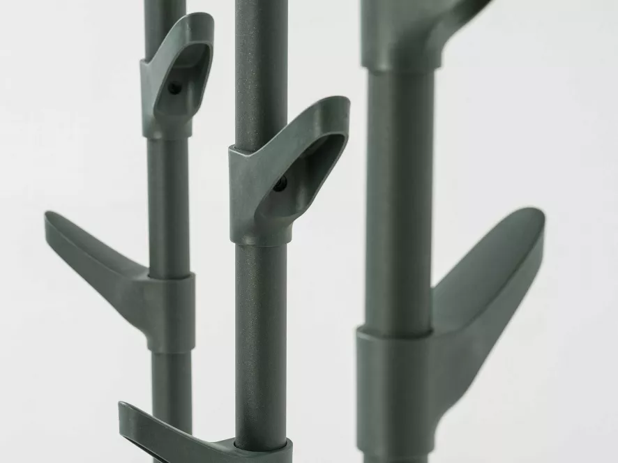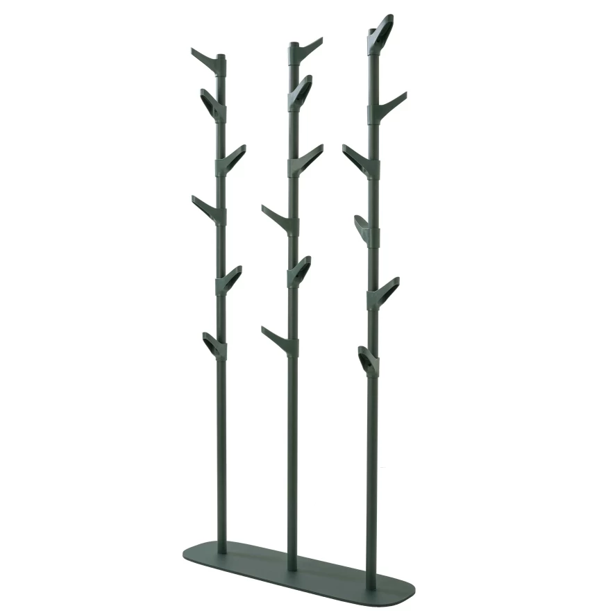 De kapstok bestaat uit drie aan elkaar bevestigde kapstokken met in totaal 18 haken, dus je kunt er lekker veel aan ophangen. De kapstok is gemaakt van in structuurlak geëpoxeerd staal en de haken zijn van kunststof. De kapstok is 171 centimeter hoog, 85 centimeter lang en 25 centimeter diep. De kapstok is beschikbaar in het wit, zwart of groen.