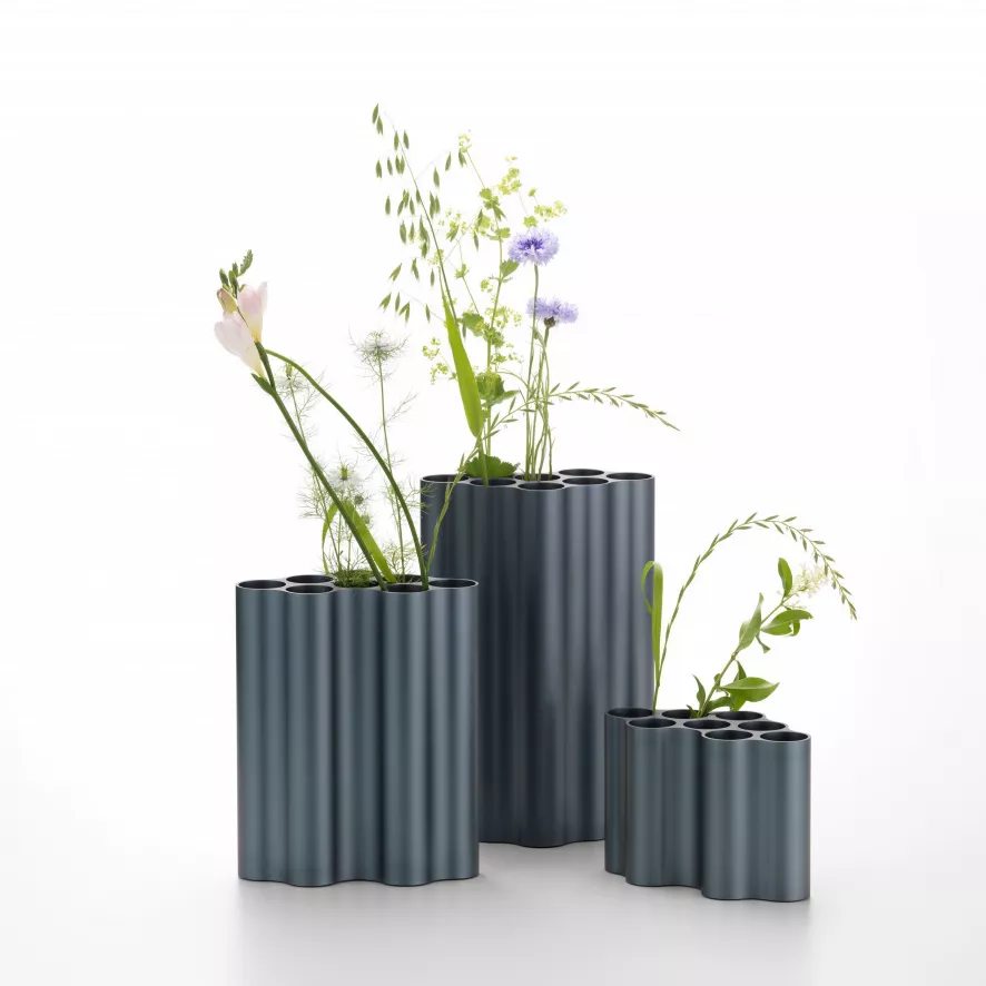 De Nuage vaas large van Vitra is gemaakt van geadoniseerd aluminium en heeft rubberen stoppen. Je kunt voor de wolkvormige vaas kiezen uit de kleuren Ivy, Light Silver, Pastel Blue en Steel Blue. De vaas maat medium heeft een breedte van 19,5 centimeter, een diepte van 11 centimeter en een hoogte van 30 centimeter. De vaas is ook beschikbaar in de maten small en medium. Onderling kun je de verschillende maten en kleuren goed met elkaar combineren.