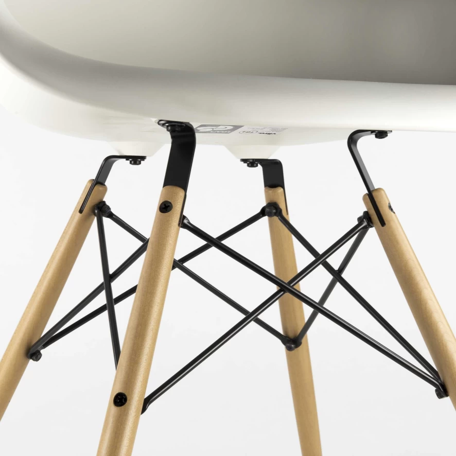 De zitting is gemaakt van kunststof en is ook te bekleden in één van de 27 kleuren in de stofsoort Hopsak. De Eames DAW stoel heeft (als nieuwe afmetingen) een breedte van 63 centimeter, een diepte van 59 centimeter en een hoogte van 83 centimeter. De zithoogte van de stoel is 43 centimeter. Deze variant heeft een onderstel van honingkleurig essen.
