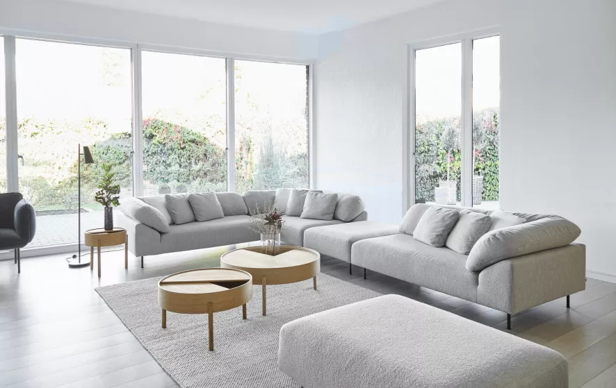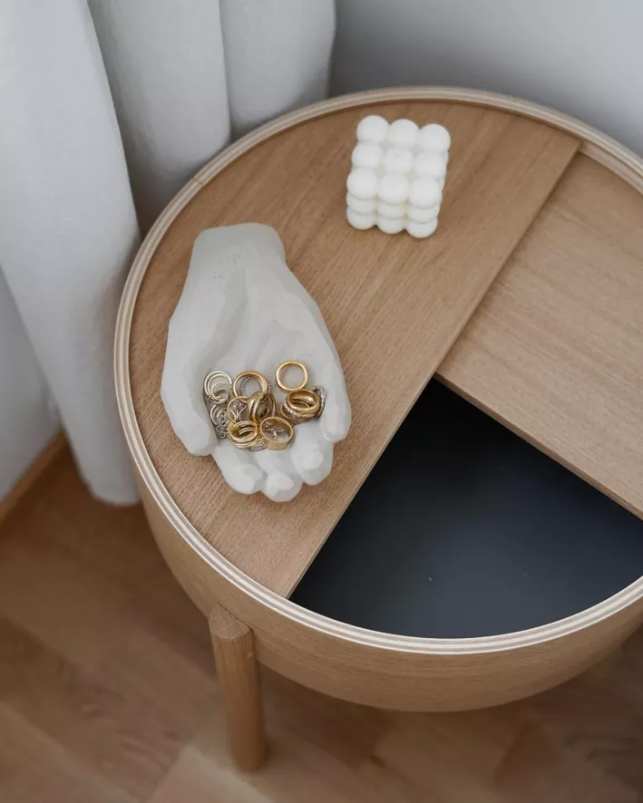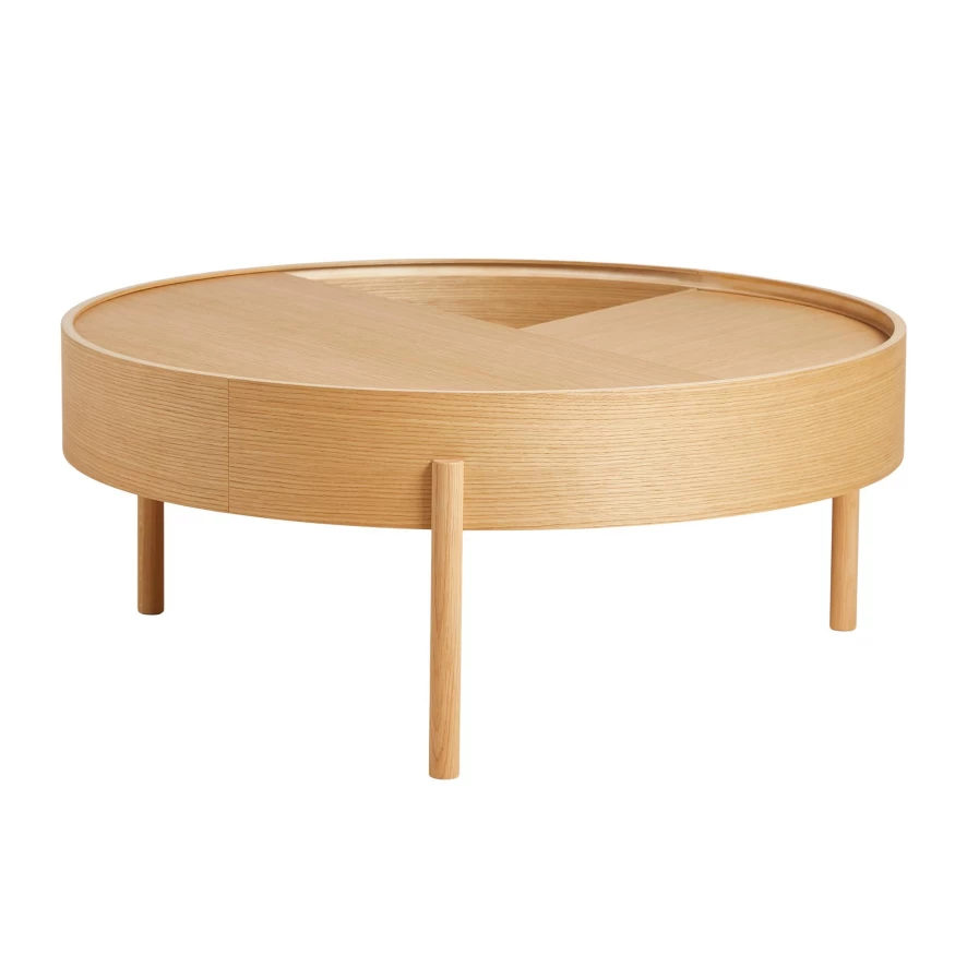 De Arc salontafel 89 van Woud Design heeft een diameter van 89 centimeter en een hoogte van 38 centimeter. De salontafel heeft massief houten poten (walnoothout, eikenhout of essenhout) en een tafelblad van houtfineer. Het tafelblad bestaat uit twee delen. Het bovenste tafelblad is draaibaar en stelt je in staat het opbergvak in de tafel te openen of te sluiten. De Arc salontafel 89 van Woud is in verschillende formaten verkrijgbaar.